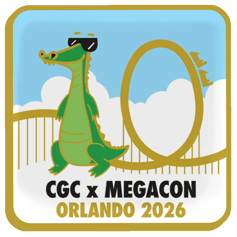 This pin is exclusive to submitters at MegaCon and marks one of the first available pins on the 2026 CGC Pin Tour. Featuring the iconic Florida gator and a rollercoaster for theme park mecca, Orlando, this Gem Mint 10 pin is sure to delight pin fans, park fans... all fans! With gold embossing and colorful enamel, this pin is ready to chomp its way into your heart.